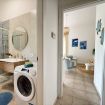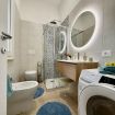Il bagno, al piano terra, è spazioso e funzionale, con doccia ampia, lavatrice/asciugatrice e tutto il necessario per un soggiorno confortevole anche a lungo termine.